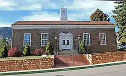 The United States post office is built upon the site of Jerome B. Wheeler's Windemere estate. The colonial style building is made of blocks of locally quarried reddish green sandstone. The post office opened in 1940[3][4] or 1941.[5] At the time it was the only United States post office to be made with locally quarried stone. The building is a one and a half storied, rectangular structure. Instead of a basement, storage is available in the half story that runs along the west side of the building. One of the town's springs is located just south of the post office.[3]