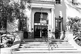 A Spanish Colonial Revival theme, influenced by the proportions and symmetry of the Italian Renaissance, was chosen for the building. In plan, the building consists of a two-story rectangular mass 193 feet wide by 165 feet deep, with a second, smaller rectangular wing, 127 feet by 60 feet, centered on the rear elevation. A tiled hip roof crowns the main wing while the rear wing is flat-roofed. A frieze containing attic vents bands the entire structure. The building has a full basement, illuminated on the principal elevations by large light wells bordered by wrought iron railings. Cement stucco sheathes the exterior above a rusticated concrete plinth which simulates granite in its appearance. Trim is primarily cast stone and concentrated around the entries on the east and west and the end bays on the north, each of which is distinguished by ornate, Classical treatments. Bays are defined solely by the fenestration.[2]