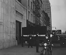 The Post Office oversaw the shipment of gold from the New York City Assay office and Philadelphia Mint to the newly constructed bullion depository at Fort Knox. The first wave of gold shipments were made semi-weekly between January 11 and June 17, 1937.[31][32] The gold was transported from the New York Assay office and the Philadelphia Mint onto trains using postal trucks and municipal police escorts.[32] In the armored train cars, postal workers were accompanied by soldiers, Secret Service agents, and mint guards.[31][33] Decoy trains were employed.[32] The gold was transferred from the train onto Army trucks under the protection of soldiers armed with armor piercing bullets and machine guns. The trucks were escorted by combat cars of the 1st U.S. Cavalry Regiment to the depository.[34] The Post Office Department billed the Treasury Department for transporting the weight of the crates and gold using the fourth class postage rate with added insurance fees.[31] A total of 157.82 million troy ounces (4,909 metric tons) were moved to Fort Knox in this wave.[32] It took over 5 months and required 39 trains consisting of 215 cars.[32] On March 5, 1941, Secretary of the Treasury Henry Morgenthau Jr. announced the completion of another shipment totaling 258.74 million troy ounces (8,048 metric tons) of gold from the New York Assay office to the depository. This shipment began in July of the previous year. It took seven months and required 45 trains consisting of 337 cars.[35]