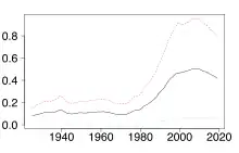 Crime rates in low-income areas are much higher than in middle to high class areas. As a result, Incarceration rates in low-income areas are much higher than in wealthier areas due to these high crime rates.[43] When the incarcerated or criminal is a youth, there is a significant impact on the individual and rippling effects on entire communities. Social capital is lost when an individual is incarcerated. How much social capital is lost is hard to accurately estimate, however Aizer and Doyle found a strong positive correlation between lower income as an adult if an individual is incarcerated in their youth in comparison to those who are not incarcerated.[44] 63 percent to 66 percent of those involved in crimes are under the age of thirty.[43] People incarcerated at a younger age lose the capability to invest in themselves and in their communities. Their children and families become susceptible to financial burden preventing them from escaping low-income communities. This contributes to the recurring cycle of poverty that is positively correlated with incarceration.[45] Poverty rates have not been curbed despite steady economic growth. Poverty is not the sole dependent variable for increasing incarceration rates. Incarceration leads to more incarceration by putting families and communities at a dynamic social disadvantage.[46]