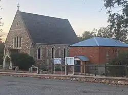 Monger himself was the successful tenderer.[4] Good progress on the chapel was reported in August 1853.[5] Funding for roofing was being solicited in November 1853.[6] George Wansbrough and his brother John (who were Wesleyans)[7] worked on the roof.[8] One local complained that ticket-of-leave men were not available to be employed in construction of the chapel.[9][lower-alpha 1]