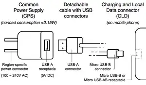 The Open Mobile Terminal Platform industry forum (OMTP) specified the requirements of the GSMA's Universal Charging Solution and published these requirements under the title "Common Charging and Local Data Connectivity" in 2009. This document specified the three components of a common charging solution (CCS): a charging and local data connector (CLD) on the "terminal" (e.g., a mobile phone) consisting of a micro USB-B (2.0) or micro USB-AB (2.0) receptacle; a common power supply (CPS) with a USB type-A receptacle; and a detachable USB type-A to micro USB-B (2.0) cable to connect the power supply with the mobile phone.[15] As of early 2011, an additional 10 service providers and one additional mobile phone manufacturer had joined the agreement.[16]