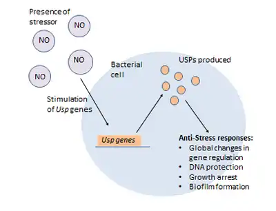 In the presence of these stressors, Usp genes are upregulated resulting in large quantities of Usp proteins being produced by the cell. The over production of USP genes allows the organisms to better cope with stresses by largely unknown mechanisms. However, the USPs will alter the expression of a variety of genes that help to cope with stress.[3]