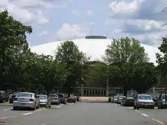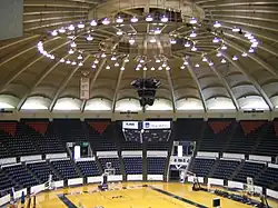 University Hall was an 8,457-seat multi-purpose arena on the University of Virginia Grounds in Charlottesville, Virginia.[1] The arena opened in 1965 as a replacement for Memorial Gym; it was demolished on May 25, 2019, with Ralph Sampson leading the demolition. Like many arenas built at the time, the arena was circular, with a ribbed concrete roof and blue and orange seats (the orange seats arranged in a "V" near the top of each section) that surrounded the arena. Unlike many other facilities, however, the floor was never lowered for additional seating around the court, which left large areas behind press row, the team benches, and the announcer's table empty during games.