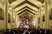 The hall features are by Leonard French, who decorated the western or rostrum end with Regeneration (1972) and was also commissioned to create The Journey series (1974) of ten paintings that also decorate the Hall.[1]