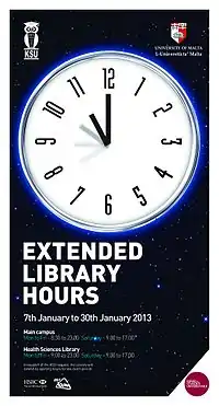 The library of University of Malta, in collaboration with the KSU's proposal, launched its extended hours to facilitate students with their studies. In 2013, the library hours were extended for the Health Sciences library, to increase the study areas available and accommodate more students.[16][17][18]