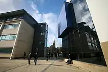 A notable feature of the University of Huddersfield in recent years has been the amount of building work taking place on the Queensgate campus. The Creative Arts Building opened in 2008, and it has since been adorned by a large piece of public art in the form of the poem Let There Be Peace, by Lemn Sissay.[36] The new £17 million Business School opened in 2010, followed by the £3 million Buckley Innovation Centre in 2012, the £22.5 million Student Central building in 2014, and the £27.5 million Oastler Building for Law and the School of Music, Humanities and Media, in 2017.[37] Redevelopments of existing buildings include the creation of the £1 million Holocaust Centre, opened in 2018.[38]