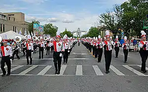 During the university's Fall semester, the band rehearses from 4:30pm to 6:30pm on Mondays, Wednesdays, and Fridays. Membership includes the brass and woodwinds, drumline, the feature twirler, colorguard, and drum majors. It is composed of students at the university (music majors and non-music majors alike) as well as select students of other Metroversity colleges that don't have a marching band program of their own. Members receive both a college credit and a scholarship for participation. The band has performed on MTV and has had musical greats join them in performance such as world-renowned trumpeter, Wynton Marsalis. The group was chosen to perform for the Captain's Celebration of the 2008 Ryder Cup[2] at the Valhalla Golf Club. The group has also been featured and/or written about on ESPN,[3] FOX Sports, Good Morning America, ABC World News Tonight with Charlie Gibson, Inside Edition, and ABC's Extreme Makeover: Home Edition.[4]