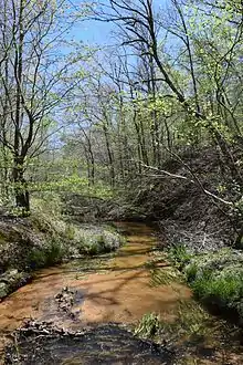 The UMFS is within the designated borders of Holly Springs National Forest, although none of the directly adjoining land is managed or owned by the U.S. Forest Service.[4] The soils at the field station are primarily sandy and sandy-loam soils.[1] The soils were originally primarily loess but were severely degraded from forest clearing and poor agricultural practices that occurred after European settlement in 1832.[5] There are several springs in the area that provide a year-round supply of water to the field station's streams and ponds.[2]: 3 Elevations range from just under 400 feet (120 m) above sea level along the lower section of Bay Springs Branch to over 540 feet (160 m) on the northern edge of the field station.[4]