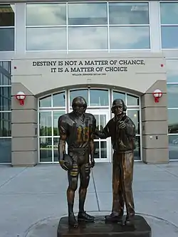 When longtime chancellor Martin Massengale was appointed president of the university system in 1991, the Board of Regents named Oregon State University provost Graham Spanier as his successor. Spanier quickly resolved Nebraska's six-million dollar budget shortfall while raising admission standards.[47] Upon the retirement of Bob Devaney as athletic director in 1992, Spanier defied the wishes of Tom Osborne and hired Bill Byrne as Devaney's replacement.[47] Osborne's program, however, was incredibly successful during Spanier's tenure, compiling a record of 45–4 and winning two national championships across four seasons. Shortly after the second of these championships, backup quarterback Brook Berringer was killed in a plane crash days before the NFL Draft, where he was projected to be a mid-round pick. Berringer, a Nebraska native, endeared himself to fans when filling in for injured starter Tommie Frazier in 1994. The university erected a statue of Osborne and Berringer at Memorial Stadium. Osborne won another national championship in 1997, his third as a head coach, before retiring and naming longtime assistant Frank Solich his replacement. Spanier left in 1996 to become president of Pennsylvania State University, where he served until 2011 when he resigned following the Penn State child sex abuse scandal. Spanier was sentenced to two months in prison for his role in the scandal.[48]