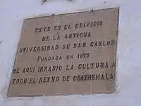 The president of the Real Audiencia authorized that classes should start while they were awaiting the authorization to build the new school for the students; at the time they only had one classroom in the Dominican convent where, in theory, they gave the Arts, Theology and Religion classes.[8] After several decades, discussions and petitions, king Carlos II on 31 January 1676, granted a license to the city of Santiago de los Caballeros de Guatemala to found a university. This would be third royal university in the Spanish Empire in America, and the second in New Spain, after the one in Mexico.[lower-alpha 3] After the disputatious process of organization, and five years after the royal decree, the university started officially its lectures of five of the nine classes, on 7 January 1681, with little more of sixty registered students and with its first president, Dr. José de Baños y Soto Mayor, who was in charge of the cathedral, Preacher of the King of Spain and Doctor from the University of Osuna.[6][lower-alpha 4] The university started under the protection of San Carlos Borromeo, with its first directive written by Francisco Saraza y Arce, who copied from those of the University of México which, in turn, were adapted from the Universidad de Salamanca in Spain.[2]