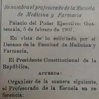 On 21 March 1893, during the government of general José María Reina Barrios, decree #193 of the National Assembly established that all the board of directors members, deans and faculty of the National University colleges would be appointed by the President of Guatemala; thus the colleges lost the autonomy to select their own authorities.[18]