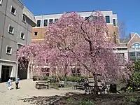 The Loyola Science Center contains 34 teaching and research laboratories, a rooftop greenhouse for teaching and research, a 180-seat lecture hall for symposia and seminars, numerous group study and research areas, 22 classrooms, 80 offices, a multi-story atrium, and a vivarium.[66] Additionally, the second floor of the Harper-McGinnis wing contains an area which highlights student, faculty, and community work and engages visitors.[67] It contains a large television which displays the University Twitter feeds, the science center's energy usage, and videos featuring student and faculty research; glass exhibits which feature research projects and science displays; and aquariams which house fish for student study from a variety of different ecosystems.[67] The Loyola Science Center also contains Bleeker Street, a coffee shop and cafe. The center was designed to meet the Silver standard for Leadership in Energy and Environmental Design (LEED) certification, though it has not gone through the certification process.[68]
