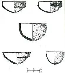 Unstan ware is the name used by archaeologists for a type of finely made and decorated Neolithic pottery from the 4th and 3rd millennia BC. Typical are elegant and distinctive shallow bowls with a band of grooved patterning below the rim,[1] a type of decoration which was created using a technique known as "stab-and-drag". A second version consists of undecorated, round-bottomed bowls.[2] Some of the bowls had bits of volcanic rock included in the clay to make them stronger. Bone tools were used to burnish the surfaces to make them shiny and impermeable.[3]