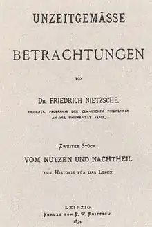 Untimely Meditations (German: Unzeitgemässe Betrachtungen), also translated as Unfashionable Observations[1] and Thoughts Out of Season,[2] consists of four works by the philosopher Friedrich Nietzsche, started in 1873 and completed in 1876.