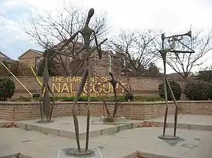 Further west is another of Spaulding's sculptures, Jammin' on the Avenue, which is installed at the entrance to historic Lockefield Gardens apartments, where the artist was born.[3] Lockefield Gardens was the city's first major public housing project, which was racially segregated at first, in the heart of Indianapolis's African American community. New construction and renovation of Lockefield Gardens' seven remaining historic buildings are home to IUPUI students, staff, faculty, and anyone wishing to live in this cultural area, known as the Indiana Avenue Cultural District.[3][7]