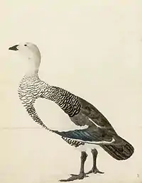The upland goose was formally described in 1789 by the German naturalist Johann Friedrich Gmelin in his revised and expanded edition of Carl Linnaeus's Systema Naturae. He placed it with the other ducks, geese and swans in the genus Anas and coined the binomial name Anas picta.[5] Gmelin based his description on the "Painted goose" that had been included by the English ornithologist John Latham in his A General Synopsis of Birds. The species had been observed in 1775 on the Isla de los Estados (Staten Island) during Captain James Cook's second voyage to the Pacific Ocean.[6] The naturalist Joseph Banks had provided Latham with a water-colour drawing of the goose by Georg Forster who had accompanied James Cook. It is the holotype for the species and is held by the Natural History Museum in London.[7] The upland goose is now placed with four other species in the genus Chloephaga that was introduced in 1838 by the English naturalist Thomas Campbell Eyton.[8][9] The genus name comes from the Ancient Greek khloē meaning "grass" and -phagos meaning "-eating". The specific epithet picta is from Latin pictus meaning "painted.[10]