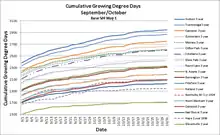 The region has two major rivers running through it, the Hudson River and the Mohawk River. It is bounded by the Taconic Mountains to the east, the Adirondack Mountains to the North and West and the Catskill Mountains to the south. The defining feature of the region which distinguished it from the surrounding areas is Growing Degree Days (GDD), as shown in the chart. The Cumulative GDD chart displays data from 19 locations from September 1 to October 31. Being that the data is a three-year average, more than 10,000 data points are used. Those locations within the AVA are represented with dotted lines. Those locations outside the region are solid lines. The five temperature locations within the AVA and a location just outside the AVA (Schoharie) all lie in a grouping that plateaus at approximately 2500 GDD. The warmer locations along bodies of water have a greater GDD average and those areas in the various mountains surrounding the AVA have a lower GDD. The climate zones for the Upper Hudson AVA are predominantly zone 5A and 5B.[6] South of the city of Albany, NY and along the Hudson River is zone 6A.[6]