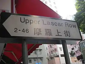 Upper Lascar Row is a narrow alley in Mid-Levels which runs parallel to Hollywood Road on the north side. The straight alley measures over 500 feet (150 m), and there was an Indian police dormitory in the street. On 11 February 1911 a fire broke out on Upper and Lower Lascar Row, destroying 16 houses and damaging another 24.[6]