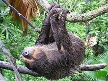 The arboreal two-toed sloth, a South American mammal in the order pilosa, have limbs so highly adapted to hanging in branches that it is unable to walk on the ground where it has to drag its own body using the large curved claws on its foredigits. [14]