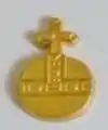 The coat of the arms of the Uppland Regiment (S 1/Fo 47) 1974–2000 and the Uppland Regiment (S 1) 2000–2006. Blazon: "Gules, the provincial badge of Uppland, a mound or, banded and ensigned with a cross-crosslet. The shield surmounted a cluster of bolts, or".[2]