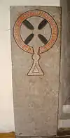 This runestone from c. 1100 is in the style RAK. It is in the wall of the porch of the church of Vallentuna. The U 215 contains the first part of the message. The stones were carved in memory of a man who drowned in Holmr's sea, but runologists are divided on the meaning of the expression. One interpretation proposed by Jansson is that it means the "Novgorodian sea" and refers to the Gulf of Finland.[3] The runestone provides the earliest Swedish attestation of an end rhyme,[4] whereas the earliest Old Norse attestation is Höfuðlausn composed by Egill Skallagrímsson.[5]
