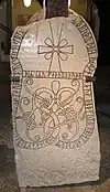 This runestone in style Fp is found in Mervalla on the island of Selaön in lake Mälaren. It is raised in memory of a man who regularly sailed a valuable knarr to Zemgale, passing Cape Kolka (Dómisnes). North of the Cape there is a long underwater reef which probably was infamous among the sailors of the Viking Age, and this is probably why Sigríðr wanted posterity to know that her husband had often passed it.[10] The expression dyrum knærri ("valued cargo-ship") is an instrumental dative and it also appears in a famous stanza by the Icelander Egill Skallagrímsson.[10] Egill had written that his mother had promised him a fast ship so that he could sail with the Vikings and[10]