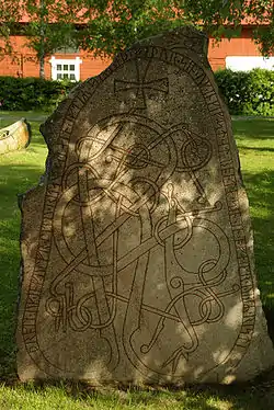 The runic text states that the stone was raised by two brothers named Þrótti and Ingulfr as a memorial to their father Sigviðr and by a woman named Ingifastr to her husbandman. The name Ingifastr was carved in runes as inkifa=st, which uses a bind rune to combine an a-rune and an s-rune.[4] Another inscription which used a bind rune to combine these same two runes, which was also signed by Öpir, is the Varangian runestone Sö 308 from Vid Järnavägen.[4] Bind runes appear disproportionately in names in runic texts, and it has been suggested that they may have been sometimes used to draw attention to a name, similar to the way that initial capital letters are used to start names in European languages today.[5]