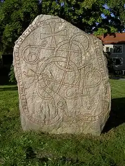 The runic text, which is missing in one section of the damaged runestone, states that the stone was raised by Helga in memory of her husband Svertingr and her sons Eysteinn and Hemingr. The text ends with "and Ígulfastr," who is understood as being the runemaster who carved the inscription. U Fv1953;263 is the only surviving runestone signed by Ígulfastr, although the inscription on U 961 in Vaksala states that it was arranged by Ígulfastr and carved by the runemaster Öpir.[2] Stylistically the work of Ígulfastr is very similar to that of Öpir, although it is not known which runemaster influenced the other.[2] The runic text uses a bind rune, which is a ligature, combining an a-rune and l-rune in the name Svertingr.[1] In addition, the runemaster connected the u-rune and l-rune in his signature.[1] In some names on runestones, bind runes may have been ornamental and used to highlight the name.[3] Lastly, an h-rune was left off at the beginning of the names Helga and Hemingr.[1]