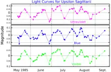 - Malcolm, G. J.; Bell, S. A. (1986). "Evidence for pulsation in the hydrogen-deficient binary Upsilon Sagittarii". Monthly Notices of the Royal Astronomical Society. 222 (3): 543. Bibcode:1986MNRAS.222..543M. doi:10.1093/mnras/222.3.543.