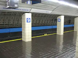 The first PATH stop in New York is at the Christopher Street station; service continues uptown to the 33rd Street terminal, making intermediate stops at Ninth Street, 14th Street, and 23rd Street.[5] Two stations formerly existed at 19th Street and 28th Street. The ornately-designed stations in Manhattan featured straight platforms, each 370 feet (110 m) long and able to accommodate 8-car consists.[6] The stations underneath Sixth Avenue (14th, 19th, 23rd, and 28th streets, and the original 33rd Street Terminal) contain round columns with scrolls and the station name near the ceilings. The exposed steel rings of the tunnel's structure can be seen at Christopher and Ninth streets.[7]