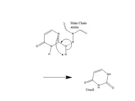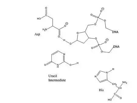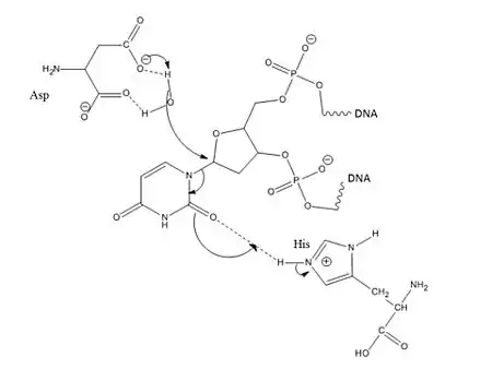 The position of the residues that activate the water nucleophile and protonate the uracil leaving group are widely debated, though the most commonly followed mechanism employs the water activating loop detailed in the enzyme structure.[12][14] Regardless of position, the identities of the aspartic acid and histidine residues are consistent across catalytic studies.[10][11][12][14][15]