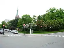 Uranienborg is the site of Uranienborgparken, the park where Uranienborg Church is located. The park contains a bronze statue of the Lutheran church reformer Hans Nielsen Hauge. The church is noted for its interior design by architect Arnstein Arneberg and for its stained glass by the artist Emanuel Vigeland.[2]
