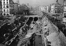 In the middle of the century, the Diputation of Barcelona took charge of establishing new road layouts in the Barcelona plain: the Sarrià road (now Sarrià Avenue), designed by Ildefons Cerdà and built between 1850 and 1853; the road from Sants to Les Corts (1865-1867); and the road from Sagrera to Horta (1871), now Garcilaso Street.[57] In these years, the port, increasingly important as a source of raw materials —especially cotton and coal—, was improved with the construction of a new wharf and the dredging of the port by the engineer José Rafo, who presented his project in 1859.[92]