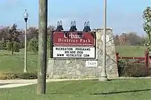 Finished in 2012, the Urbana District Park is a 95-acre (38 ha) park located near the intersection of Md. Route 355 and Lew Wallace Street. Villages of Urbana developer Tom Natelli dedicated the land for the park in 2004.[15] The goal of the first phase of the new development of Urbana District Park was to provide athletic facilities and several passive recreational amenities for the southern region of Frederick County. The $5.9 million Phase I construction included two multipurpose fields, one football/lacrosse field, one baseball field, one softball field, one little league field, a new entrance drive, parking, walking/biking trails, water and electric utilities, restrooms, picnic pavilions, playground, a park maintenance facility, landscaping/reforestation and various site amenities. The site also contains three parking lots for a total of 466 parking spaces. The park's walking trails connect directly to the main Villages of Urbana walking trails. Today, the park houses a total of five baseball fields and a soccer field.