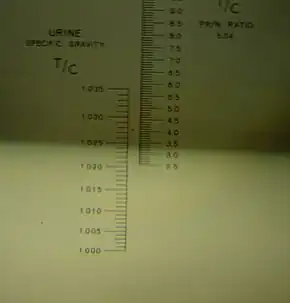 Reading of a urine specific gravity of ~1.024 via a handheld refractometer. SG measurement is taken by reading the boundary between the dark and light fields against the graduations on the left column.