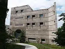 To the west of Tjaden Hall is the Herbert F. Johnson Museum of Art (1973) designed by I.M. Pei. The original design included an underground gallery north of the main structure. Early designs extended this space under University Avenue and included windows overlooking Fall Creek gorge. This gallery was not built due to funding. However, in response to a dramatic increase in the museum's collection, an altered version of that addition, totalling 16,000 square feet (1,500 m2) of above and below ground space was built to the north of the existing building. It was designed by the original building's architects at Pei Cobb Freed & Partners, including the original architect-in-charge, Cornell alumnus John L. Sullivan, III and opened in October 2011.[11] Previously, Morse Hall stood next to Franklin/Tjaden Hall, but it was destroyed by a fire in 1916.
