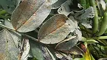There are various ways to manage the disease Uromyces viciae-fabae var. viciae-fabae, however because the spores of the fungus can travel long distances to infect a new crop prevention can be difficult.[5] First, using clean seed to plant the beans is best to prevent the spread of the pathogen. Using contaminated seeds from plots where the disease was is an easy way to spread the disease to other locations. Secondly, spores that land on volunteer plants, which are plants that grow on their own from seeds floating by wind or birds, can be spread long distances by wind increasing the spread of the disease. These volunteer plants should be controlled early in the season often by the use of herbicides to kill the faba bean plant completely. Another way to control disease is to rotate crops; crops should be rotated about 500 meters from where the faba beans were last planted as a preventative measure. Since they are host specific if there are still spores present in that area they will not be able to infect the new crop planted.[6] Resistance is another control method. Resistance is the most desired means of rust control.[7] Planting a variety that is resistant to rust is helpful in preventing disease. Foliar fungicides are another way of control; recommended fungicides need to be applied before severe symptoms are seen.
