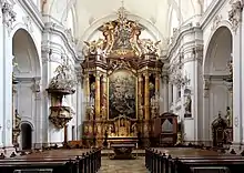 The high altar was designed by Johann Matthias Krinner, and dedicated in 1741. The altar piece dates from 1738–1740, and is by Martino Altomonte. It shows the Archangel Michael in the center, surrounded by the archangels Gabriel and Raphael.