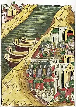 In 1371 Ushkuyniks sacked Yaroslavl, Kostroma and other Upper Volga cities. Three years later they sailed with upwards of ninety ships to pillage the Vyatka region. In 1375, they defeated the militia of Kostroma and burnt the city to the ground. The destruction was so severe that Kostroma had to be rebuilt elsewhere. After that, they looted Nizhny Novgorod and sailed down the Volga to Astrakhan, where they were annihilated by a Tatar general.