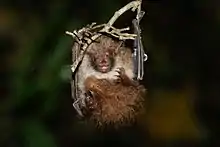 In the spring and autumn, it primarily roosts in clumps of dead leaves, but it also utilizes tree cavities and peeling tree bark.[4] Trees used for roosting include Litsea acuminata (a laurel species), Neolitsea sericea, Camellia sasanqua, Ardisia sieboldii, Cinnamomum camphora, and Ficus superba. Females switch roosts frequently, moving to a new roost every day in one study. It is colonial, with females forming maternity colonies.[6] These colonies last from June to August; the rest of the year, each sex is solitary.[7] These colonies consist of 2–22 individuals. The frequent roost-switching and variable colony sizes exhibited in maternity colonies suggests a fission-fusion social structure.[6] It is the only known bat that hibernates in snow. In the winter, it has been found roosting within cylindrical or conical holes in snowbanks. It is hypothesized that the bats excavate these cavities themselves. Hibernating within the snow may protect it from predators and prevent water loss; the snow holes likely have a stable thermal environment, as well. The only other mammal species known to hibernate within snow is the polar bear.[4]