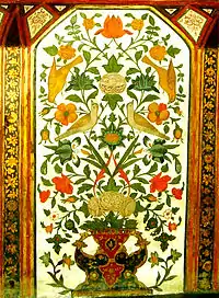 Later works of Karabakhi, saving a mastery of ancient decorative paintings are distinguished for growth of realistic features in interpretation of distinct graphic motifs. A picture drawn by him in the house of Mehmandarov in Shusha city, where images of deer and pomegranate tree are distinguished for their free interpretation and sappiness of forms, is the most famous picture of the artist. The artist created on the basis of both earlier developed canonized schemes and immediate observations.[8]