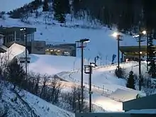 The following year, on June 15, 1991, Salt Lake City lost its 1998 Winter Olympics bid by four votes to Nagano, Japan.[2] Still, construction on the park commenced following a groundbreaking ceremony on May 29, 1991. The original estimated cost of the park was $26.3 million and included the ski jumps, bobsled/luge track, and a day lodge; following the completion of the ski jumps they were formally dedicated in a ceremony on January 9, 1993.[3] The track was designed by German luge coach Josef Lenz.[4]