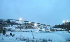 Costing about $25 million to construct, the track uses 297,000 watts of track lighting, 62 water hydrants (for ice- and snowmaking), 24 cameras, eight scoreboards, and 49 timing points.[9] Generally open from October to the end of March annually, the track takes a total of 18 days to ice down to the required thickness needed to run sliding events.[9] The track has 54 miles (87 km) of piping with 110,000 pounds (50,000 kg) of ammonia refrigeration able to keep the track to −14 °F (−26 °C).[9][10] During the operating season, a nine-man crew smooths the track daily.[10] A total of 59 temperature probes are located throughout the track to ensure the ice temperature is properly monitored.[9] Throughout the track, a $1 million retractable shading system protects the course from sun and snow, which reduces energy usage by 25 percent and the need to clear the track from snow.[9]