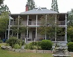 The Utica Mansion is a historic house located at 1103 Bush St. in Angels Camp, California. Built in 1882, the house was originally a two-story stone building designed in the Federal style. Robert Leeper, then owner of the Utica Mine, built the house next to the Utica Mill. Leeper sold the mine to C. D. Lane in 1884; he sold the house to Lane four years later. Lane and two other investors began to buy up mining claims in Angels Camp, and their enterprise soon became profitable. With his investment earnings, Lane began to expand the Utica Mansion. Lane added a two-story addition to the west and north sides of the house and a veranda on the other two sides. He also improved the interior furnishings by adding new wallpaper and fireplaces with English tiles, repainting the woodwork, adding gold moldings to hanging pictures, and installing Axminster carpets. Lane lived in the house until 1895, when he left to pursue an investment in Alaskan mining.[2]