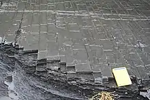 It reaches a thickness of up to 1,000 feet (300 m)[1] and can be as thin as 70 feet (20 m) towards the margins of the basin. 250 feet (80 m) are exposed in the type section.