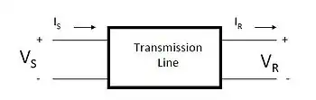 The terminal characteristics of the transmission line are the voltage and current at the sending (S) and receiving (R) ends. The transmission line can be modeled as a "black box" and a 2 by 2 transmission matrix is used to model its behavior, as follows: