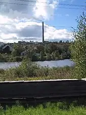 A utilidor system is used in Utqiaġvik, Alaska due to extensive permafrost underlying the city. At right foreground is a portion of the utilidor crossing Okpik Street overhead, adjacent to Barrow High School.