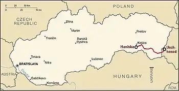 The Uzhhorod–Košice broad-gauge line is a single-track 1,520-mm-gauge railway mostly in eastern Slovakia, which is used especially for transporting iron ore from Ukraine to the steel works near Košice.