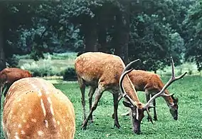 Vânători Park is one of the few places where the European bison (Bison bonasus) can be seen. There are 17 such zimbrii in a protected 180 ha (440 acres) area in Vânători-Neamț commune.[2] The aurochs head ("cap de bour" in Romanian) is the heraldic symbol of the historical province of Moldavia, although the aurochs (now extinct) was a separate species from the European bison.